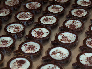Heute möchte ich die nächsten zwei Sorten meiner Weihnachtspralinen vorstellen. Bei beiden habe ich mit Zartbitterkuvertüre gearbeitet und so sehr schöne herbe Geschmackserlebnisse gezaubert. Dabei ist die Temperatureinhaltung sehr wichtig. Dunkle Schokolade verlangt sehr genaue Einhaltung der Bearbeitungstemperatur. Die besten Ergebnisse erzielt man im Bereich von 30 - 33°C. Erhitzt man die Kuvertüre höher gibt es weiße oder graue Schlieren und bei zu niedrigen Temperaturen sieht die fertige Praline stumpf aus, es fehlt einfach der Glanz.