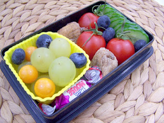 In der Beilagenschale hatte ich Gurke, Tomate, Weintrauben, Physalis, Heidelbeeren, zwei Feigen und ein Stück Schoki.