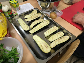 Zweieinhalb Stunden sind dafür einfach zu kurz. Vorallem da wir in dieser Zeit auch noch essen und aufräumen müssen. Deshalb hatte ich am Rezept ein wenig rumgebastelt. Beim Einkaufen hatte ich schöne türkische Auberginen bekommen, die wären für die normale Zubereitung super geeignet gewesen. Für meine Zwecke waren sie eigentlich zu klein aber da wir ja noch Vor- und Nachspeise hatten, war die fertige Portion groß genug.