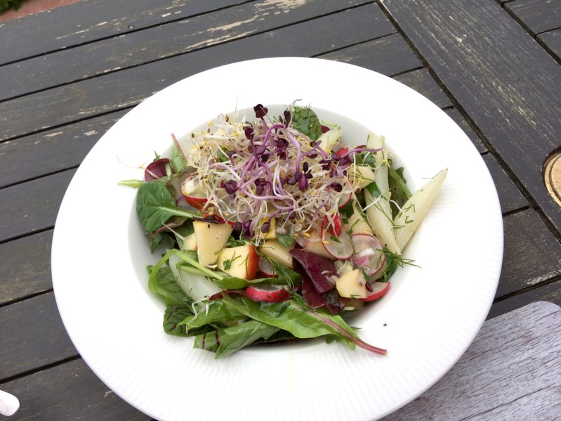 Zur Forelle musste natürlich noch ein Salat her und da gerade Spargelsaison ist, wurde es ein Spargelsalat. Den hatte ich allerdings noch mit Radieschen, Apfel und Sprossen aufgepeppt.