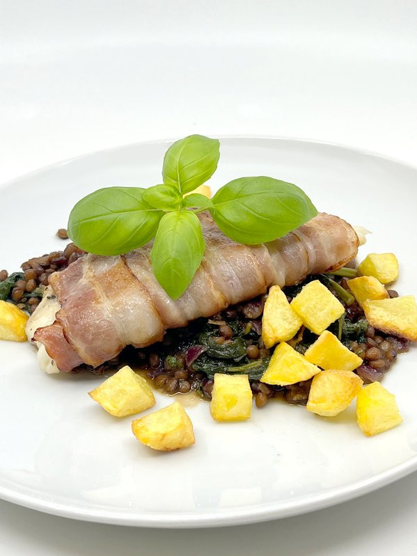 Kabeljaufilet darauflegen und mit Pfeffer würzen, danach aufwickeln. Mit